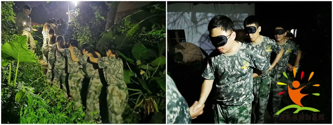 2、任意选择一组队员为哑人,告之在项目进行过程中,不能发出任何声音,包括一些“啊,呀”等语气词,其任务是带领同伴——盲人(每人带领一位)跟随教练行进指定路线,并保证同伴的安全。
